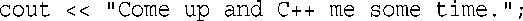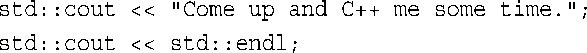 它将字符串“Come up and C++ me some time.”插入到输出流中。因此,与其说程序显示了一条消息,不如说它将一个字符串插入到了输出流中。不知道为什么,后者听起来更好一点(参见图2.2)。