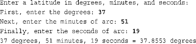 3.编写一个程序,要求用户以度、分、秒的方式输入一个纬度,然后以度为单位显示该纬度。1度为60分,1分等于60秒,请以符号常量的方式表示这些值。对于每个输入值,应使用一个独立的变量存储它。下面是该程序运行时的情况: