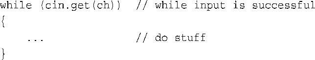 方法cin.get(char)的返回值是一个cin对象。然而,istream类提供了一个可以将istream对象(如cin)转换为bool值的函数;当cin出现在需要bool值的地方(如在while循环的测试条件中)时,该转换函数将被调用。另外,如果最后一次读取成功了,则转换得到的bool值为true;否则为false。这意味着可以将上述while测试改写为这样:
