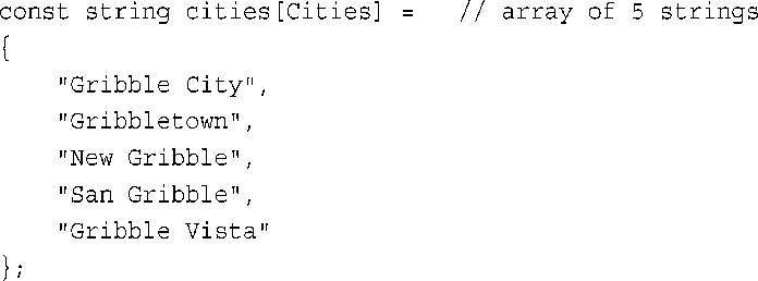 通常,定义一个const值来表示数组中的元素个数是个好办法。在声明数组和引用数组长度时(如在for循环中),可以使用const值。
