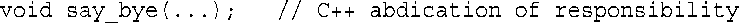 在C++中,括号为空与在括号中使用关键字void是等效的——意味着函数没有参数。在ANSI C中,括号为空意味着不指出参数——这意味着将在后面定义参数列表。在C++中,不指定参数列表时应使用省略号: