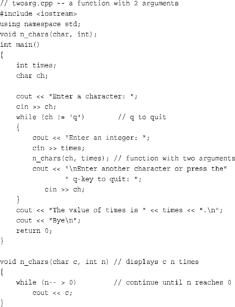 程序清单7.3演示了一个接受两个参数的函数,它还表明,在函数中修改形参的值不会影响调用程序中的数据。