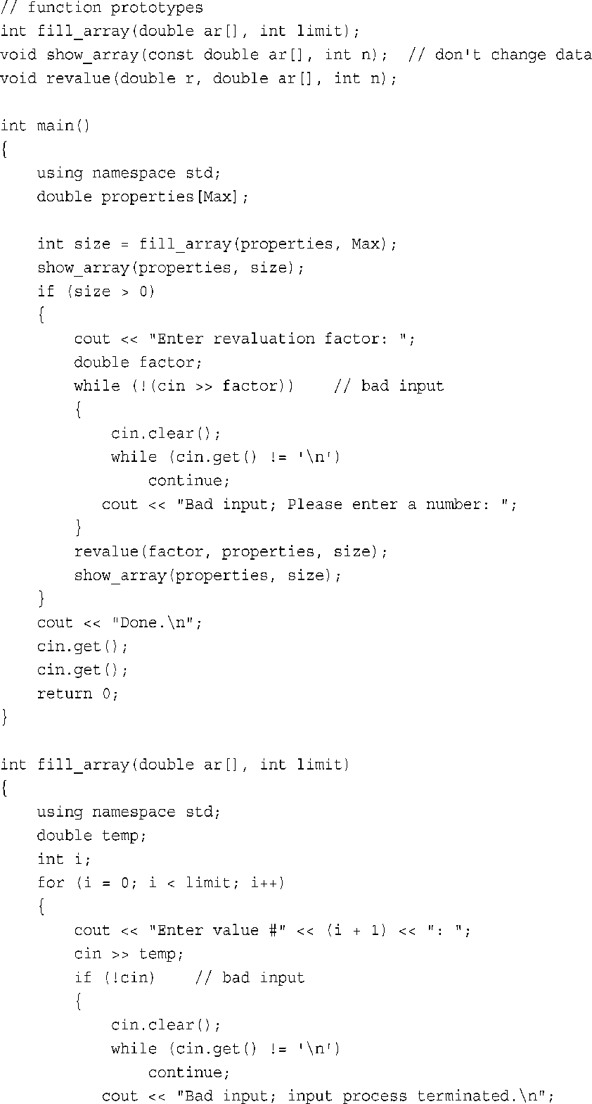 Fill_array( )将一个double数组的名称和长度作为参数。它提示用户输入double值,并将这些值存储到数组中。当数组被填满或用户输入了非数字时,输入将停止,并返回实际输入了多少个数字。