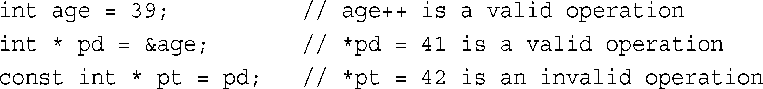 这两个声明都表明,arr是指向typeName的指针,但在编写函数代码时,可以像使用数组名那样使用arr来访问元素:arr[i]。即使在传递指针时,也可以将形参声明为const指针,来保护原始数据的完整性。由于传递数据的地址时,并不会传输有关数组长度的信息,因此通常将数组长度作为独立的参数来传递。另外,也可传递两个指针(其中一个指向数组开头,另一个指向数组末尾的下一个元素),以指定一个范围,就像STL使用的算法一样。