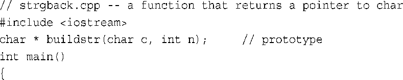 其中用int * arr替换了int arr [ ]。这证明这两个函数头都是正确的,因为在C++中,当(且仅当)用于函数头或函数原型中,int *arr和int arr [ ]的含义才是相同的。它们都意味着arr是一个int指针。然而,数组表示法(int arr[ ])提醒用户,arr不仅指向int,还指向int数组的第一个int。当指针指向数组的第一个元素时,本书使用数组表示法;而当指针指向一个独立的值时,使用指针表示法。别忘了,在其他的上下文中,int * arr和int arr [ ]的含义并不相同。例如,不能在函数体中使用int tip[ ]来声明指针。
