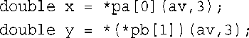 如何使用它们来调用函数呢?pa[i]和pb[i]都表示数组中的指针,因此可将任何一种函数调用表示法用于它们: