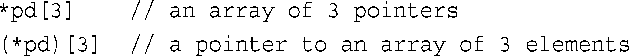 如果您喜欢自己声明,该如何办呢?显然,这种声明应类似于pa的声明,但由于增加了一层间接,因此需要在某个地方添加一个*。具体地说,如果这个指针名为pd,则需要指出它是一个指针,而不是数组。这意味着声明的核心部分应为(*pd)[3],其中的括号让标识符pd与*先结合: