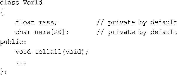 因此,作用域解析运算符确定了方法定义对应的类的身份。我们说,标识符update( )具有类作用域(class scope)。Stock类的其他成员函数不必使用作用域解析运算符,就可以使用update( )方法,这是因为它们属于同一个类,因此update( )是可见的。然而,在类声明和方法定义之外使用update( )时,需要采取特殊的措施,稍后将作介绍。