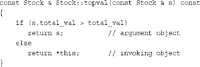 其中,s.total_val是作为参数传递的对象的总值,total_val是用来调用该方法的对象的总值。如果s.total_val大于toatl_val,则函数将返回指向s的引用;否则,将返回用来调用该方法的对象(在OOP中,是topval消息要发送给的对象)。问题在于,如何称呼这个对象?如果调用stock1.topval(stock2),则s是stock2的引用(即stock2的别名),但stock1没有别名。