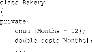 这将创建一个名为Months的常量,该常量将与其他静态变量存储在一起,而不是存储在对象中。因此,只有一个Months常量,被所有Bakery对象共享。第12章将深入介绍静态类成员。在C++98中,只能使用这种技术声明值为整数或枚举的静态常量,而不能存储double常量。C++11消除了这种限制。