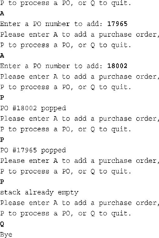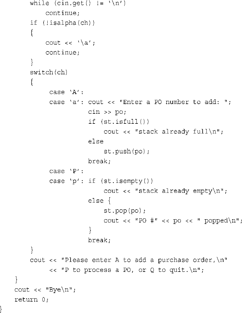 下面来测试该栈。程序清单10.12模拟了售货员的行为——使用栈的后进先出方式,从购物筐的最上面开始处理购物订单。