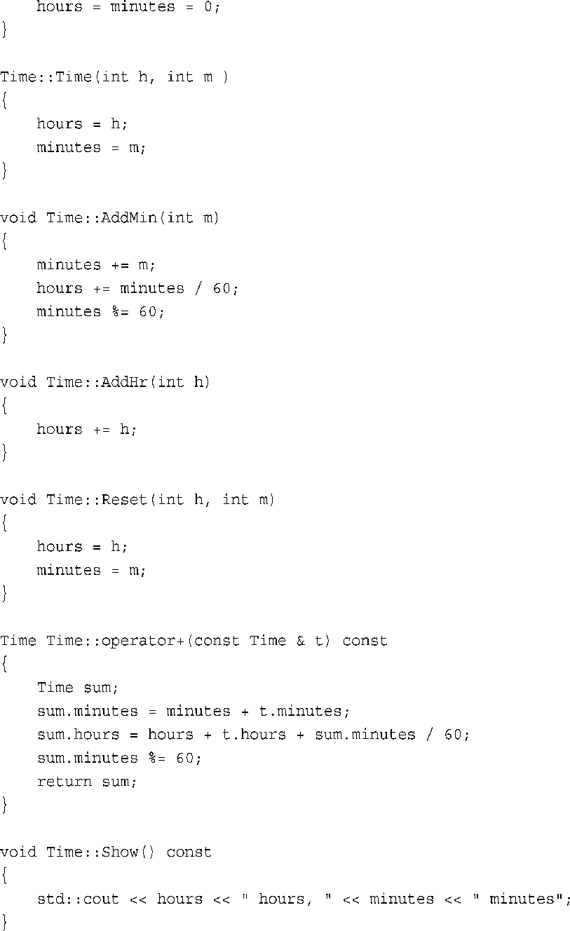 Time类提供了用于调整和重新设置时间、显示时间、将两个时间相加的方法。程序清单11.2列出了方法定义。请注意,当总的分钟数超过59时,AddMin( )和Sum( )方法是如何使用整数除法和求模运算符来调整minutes和hours值的。另外,由于这里只使用了iostream的cout,且只使用了一次,因此使用std::cout比导入整个名称空间更经济。