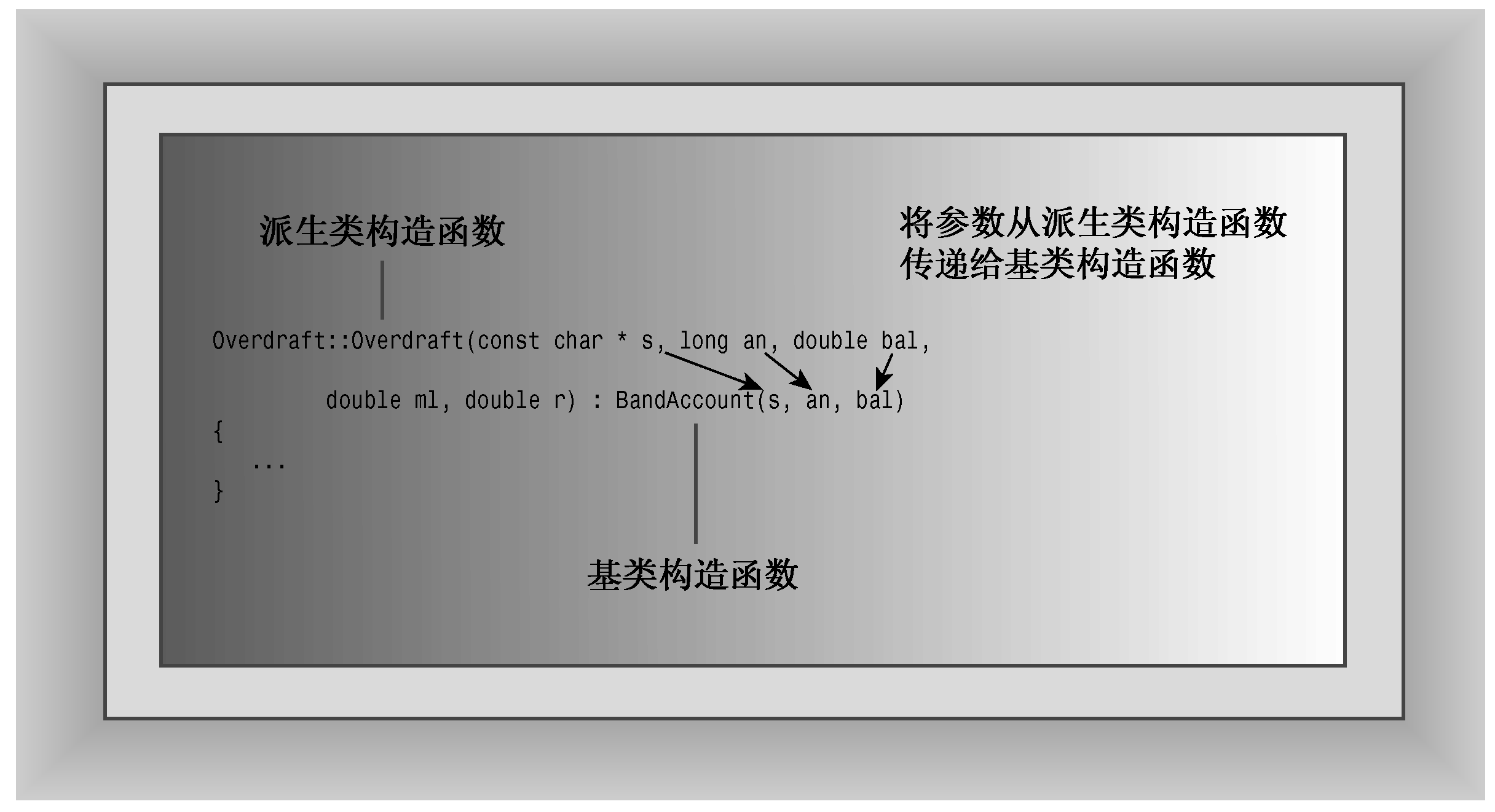 派生类构造函数可以使用初始化器列表机制将值传递给基类构造函数。请看下面的例子:
