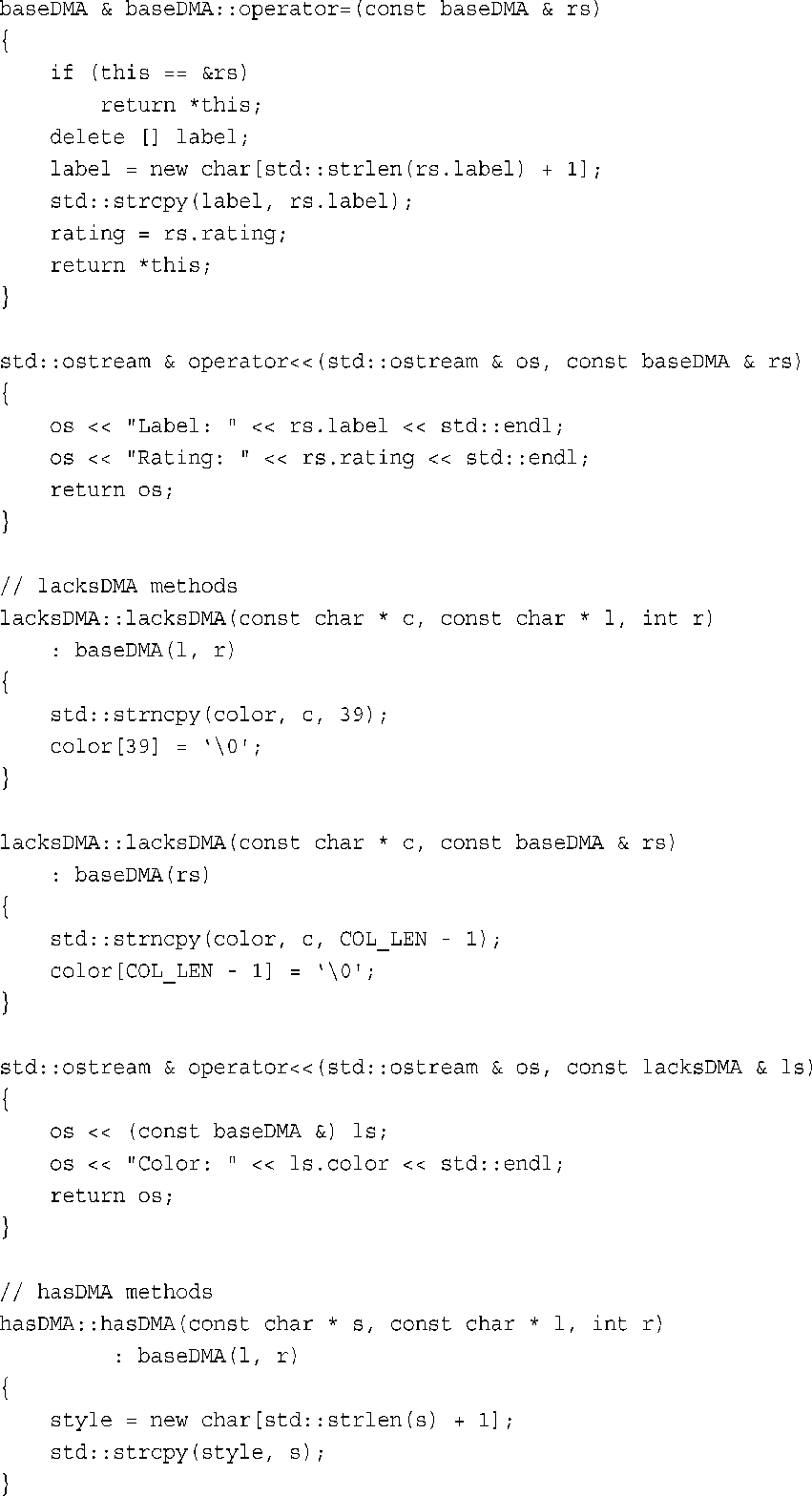 然而,如果派生类使用了new,则必须提供显式赋值运算符。必须给类的每个成员提供赋值运算符,而不仅仅是新成员。HasDMA类演示了如何完成这项工作:
