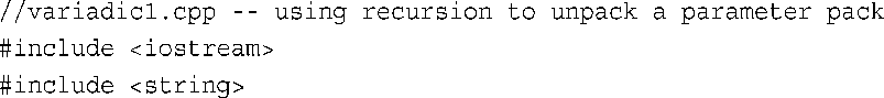 虽然前面的递归让show_list1( )成为有用函数的希望破灭,但正确使用递归为访问参数包的内容提供了解决方案。这里的核心理念是,将函数参数包展开,对列表中的第一项进行处理,再将余下的内容传递给递归调用,以此类推,直到列表为空。与常规递归一样,确保递归将终止很重要。这里的技巧是将模板头改为如下所示:
