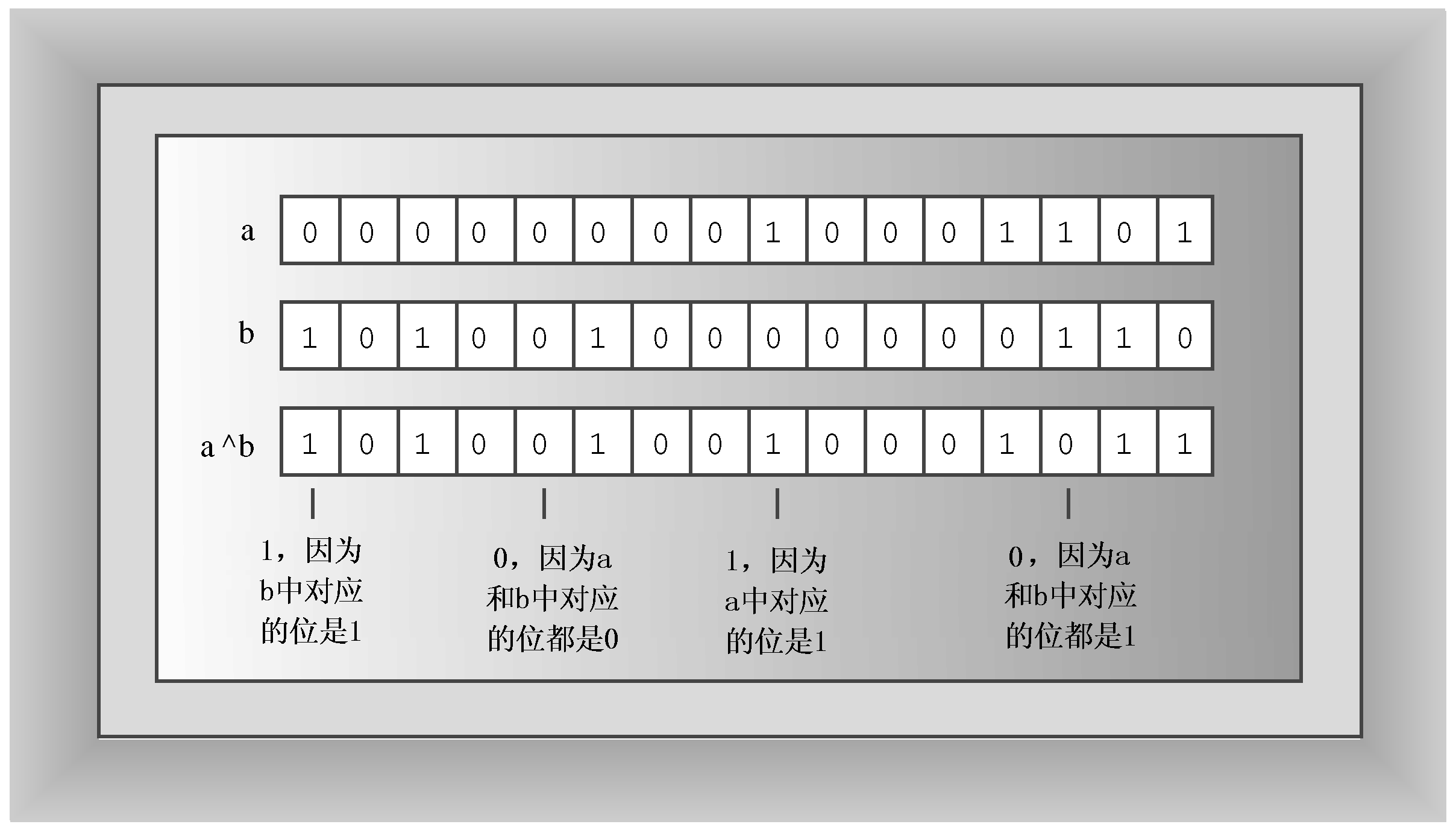 按位运算符XOR(^)将两个整数值结合起来,生成一个新的整数值。如果原始值中对应的位有一个(而不是两个)为1,则新值中相应位为1;如果对应的位都为0或1,则新值中相应位为0(参见图E.5)。