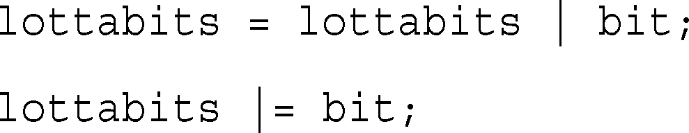它们都将对应的位设置为1,而不管这一位以前的值是多少。这是因为对1和1或者0和1执行OR操作时,都将得到1。lottabits中其他所有位都保持不变,这是因为对0和0做OR操作将得到0,对1和0做OR操作将生成1。